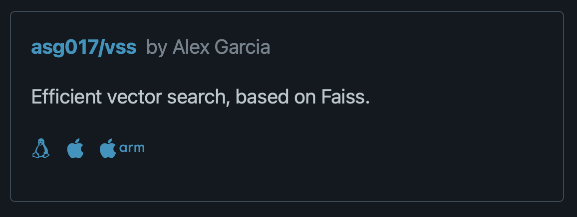 When exploring the the sqlpkg registry, the PACKAGE_IDENTIFIER needed to install an extension is the title found in the cards, always in owner/name format. For example, to install the sqlite-vss extension, which provides support for vector similarity search, you would find this package card on the sqlpkg.org site: