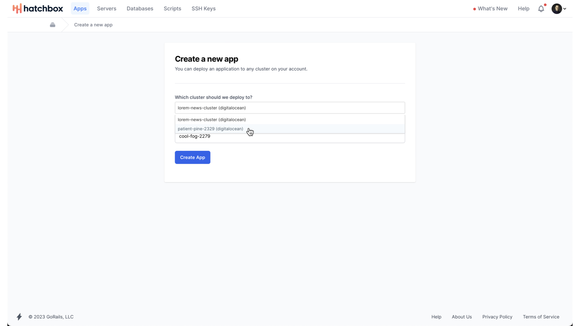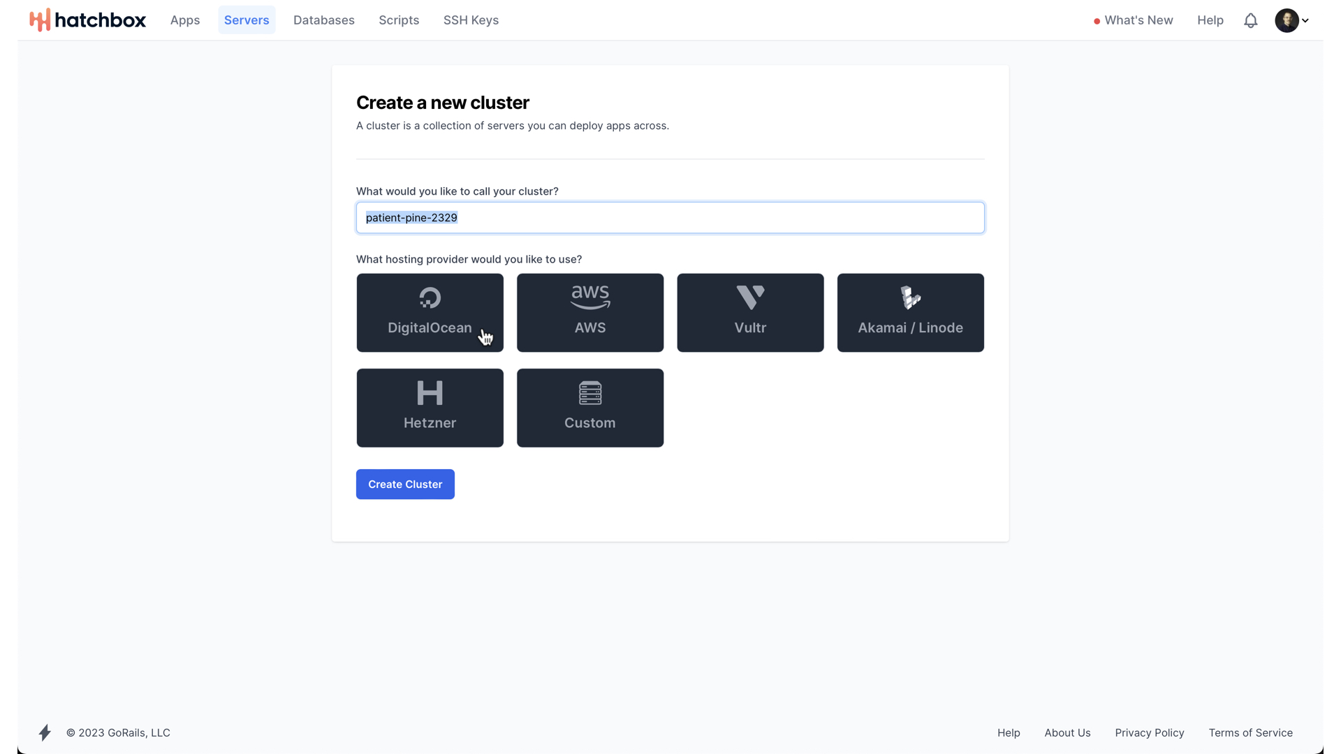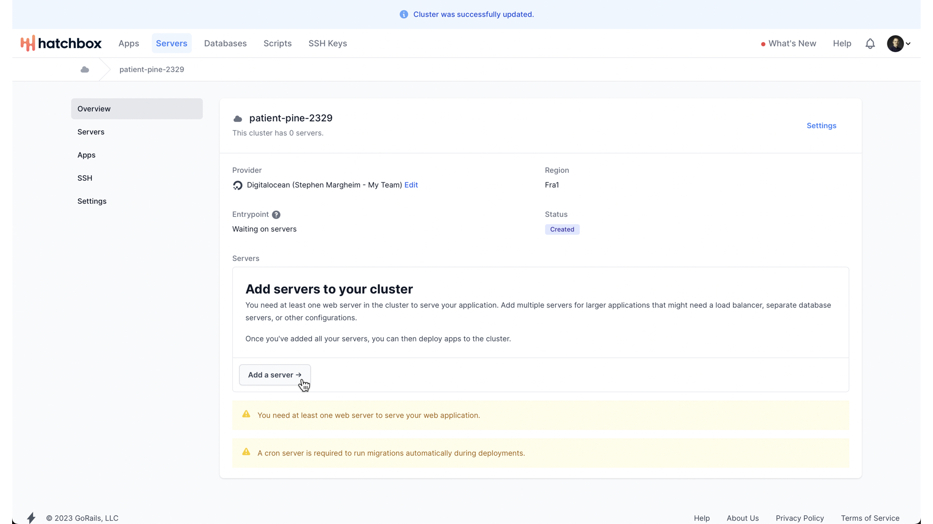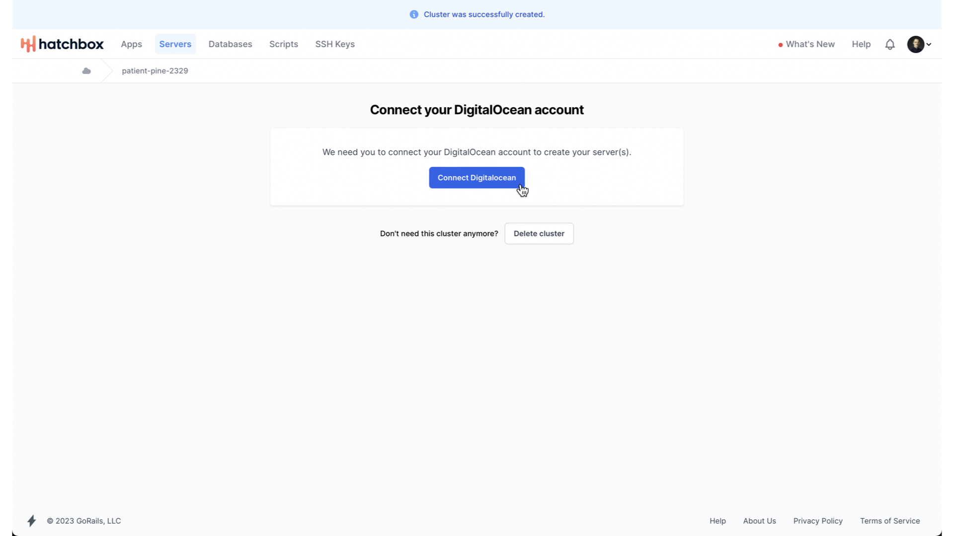 Anyway, we will create our cluster, and use DigitalOcean as our hosting provider. In the end, our cluster will only have one server, but we need to conform to Hatchbox’s view of the world nonetheless.