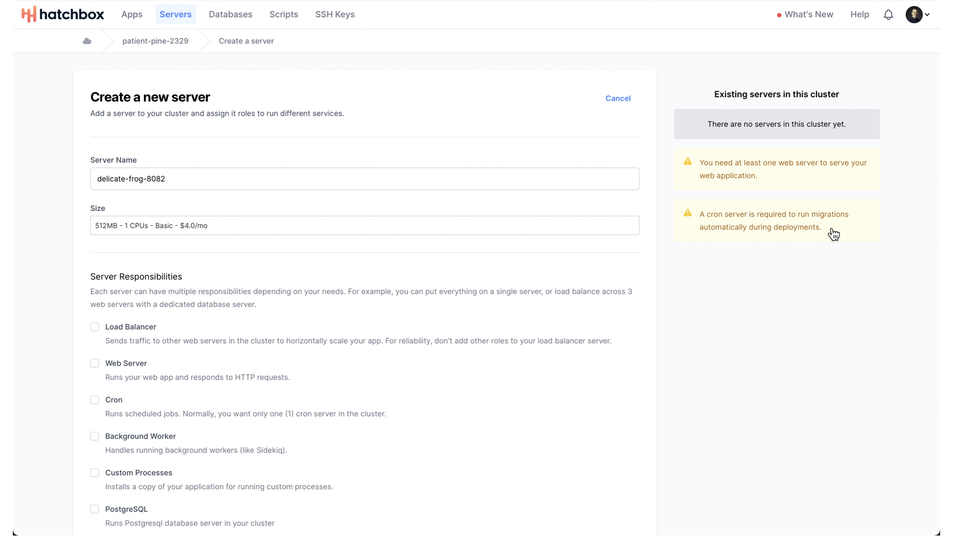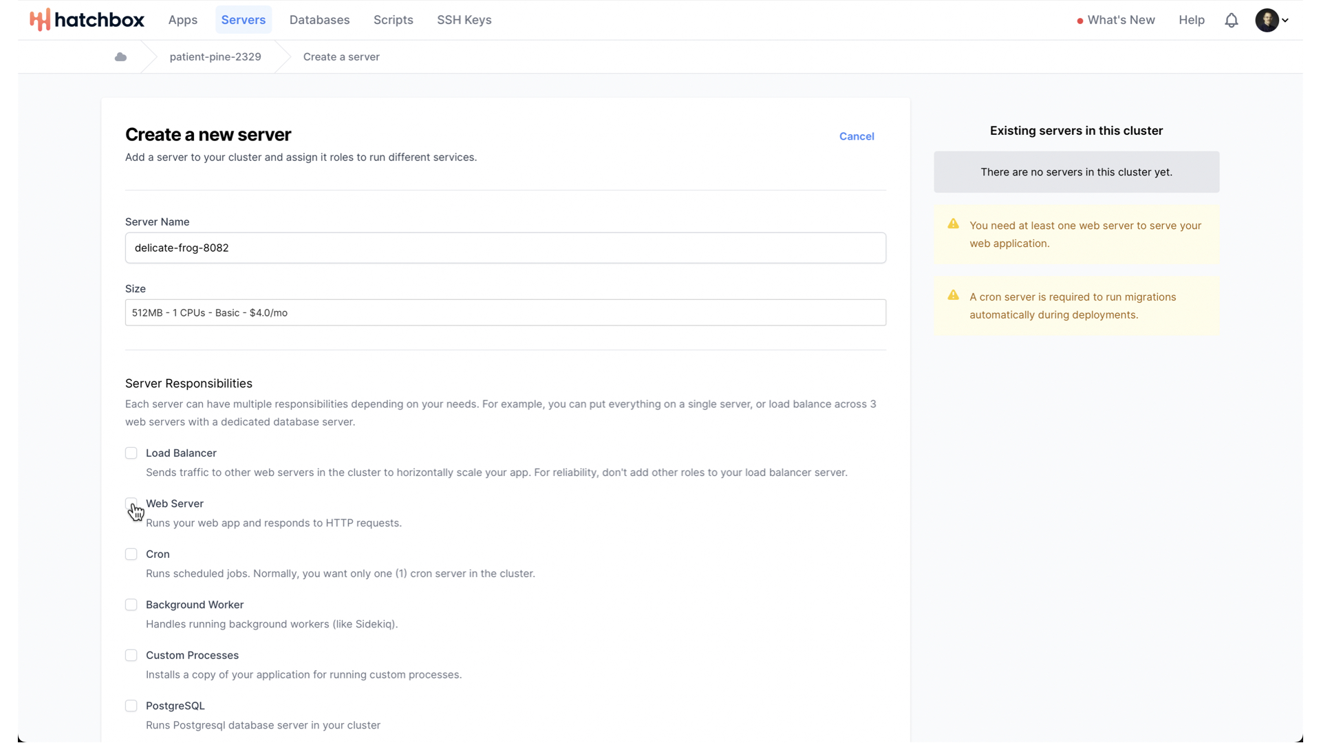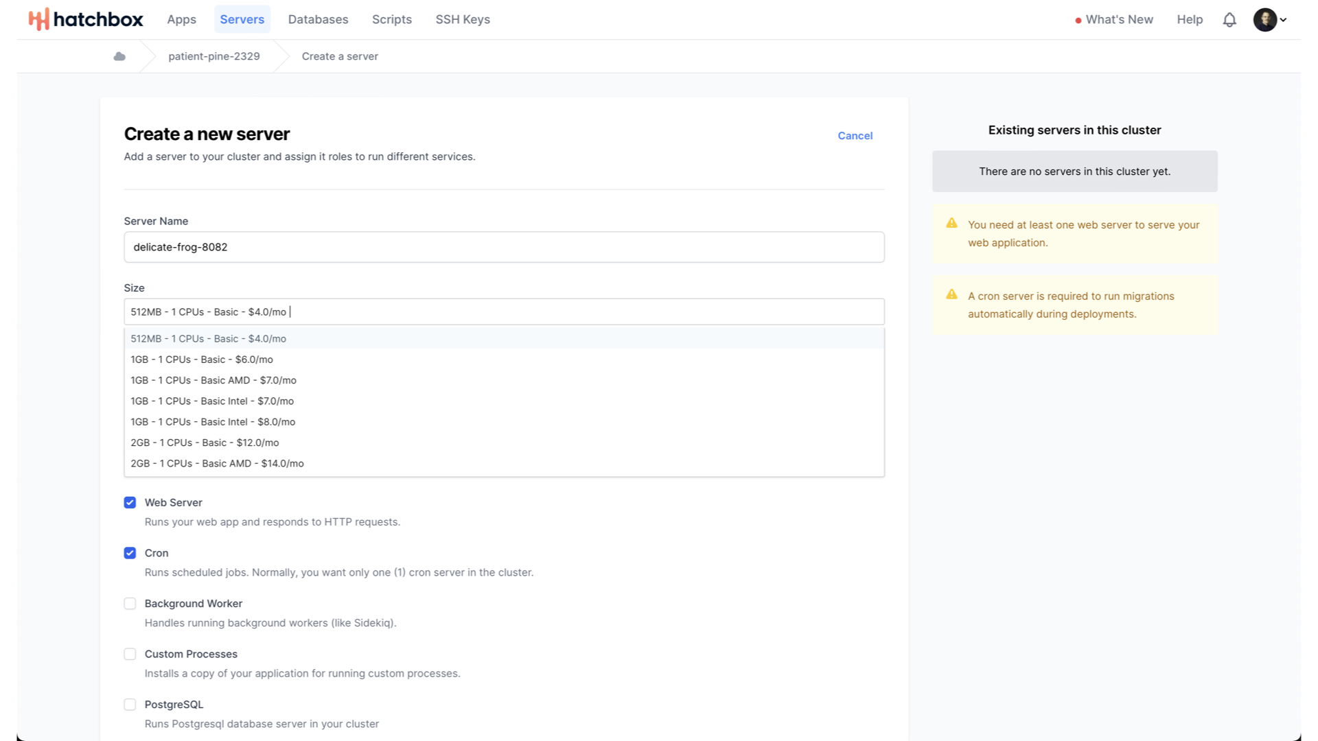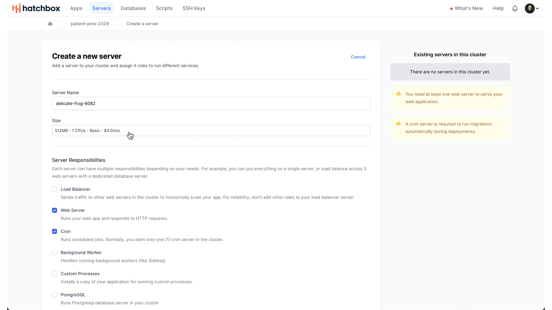 As Hatchbox will remind us, we minimally need a server with two core responsibilities—run our web app and run cron.