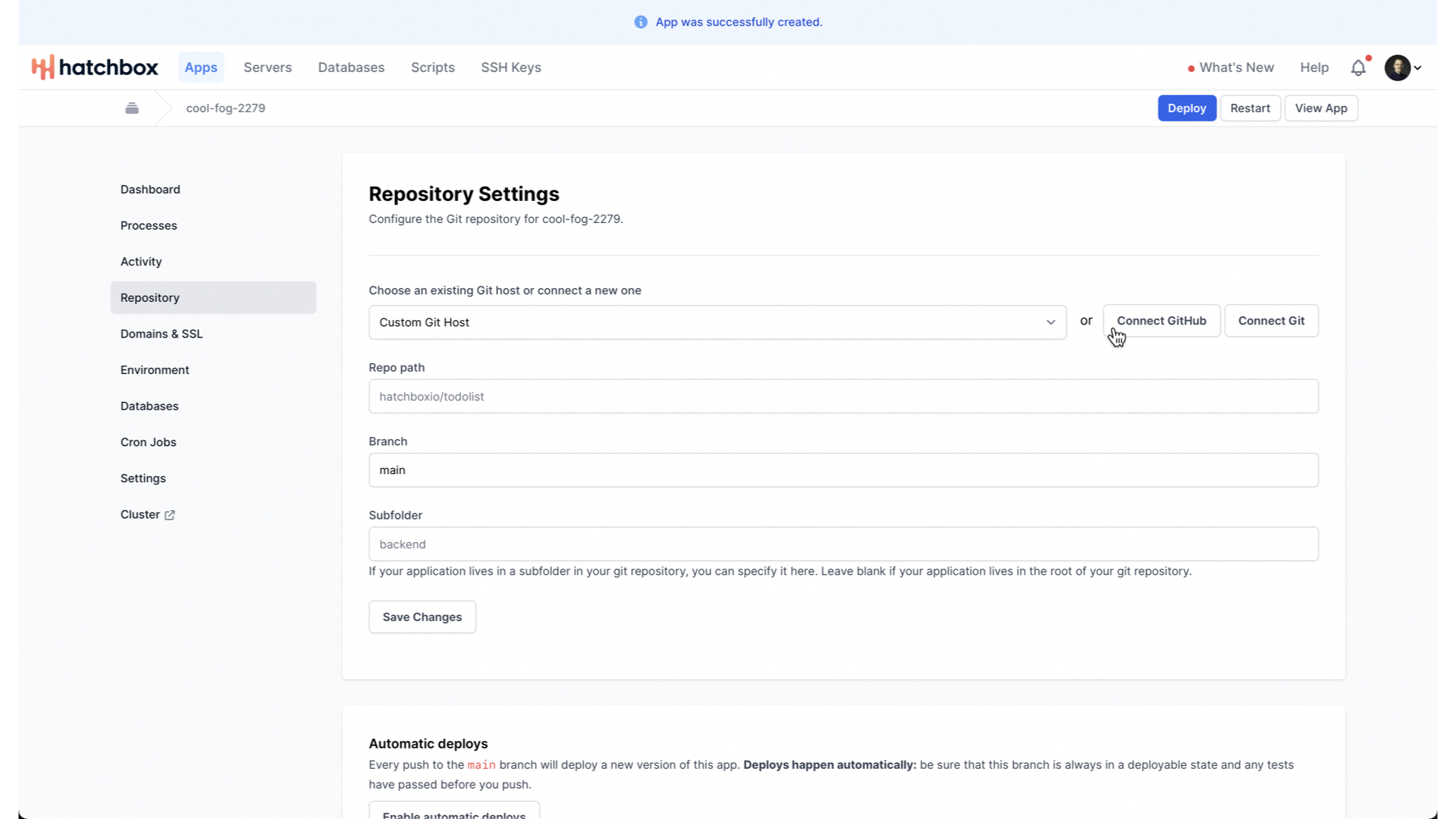 Again, Hatchbox handles the details here. And, again, you can tail the logs to see precisely what it is doing if you’d like.