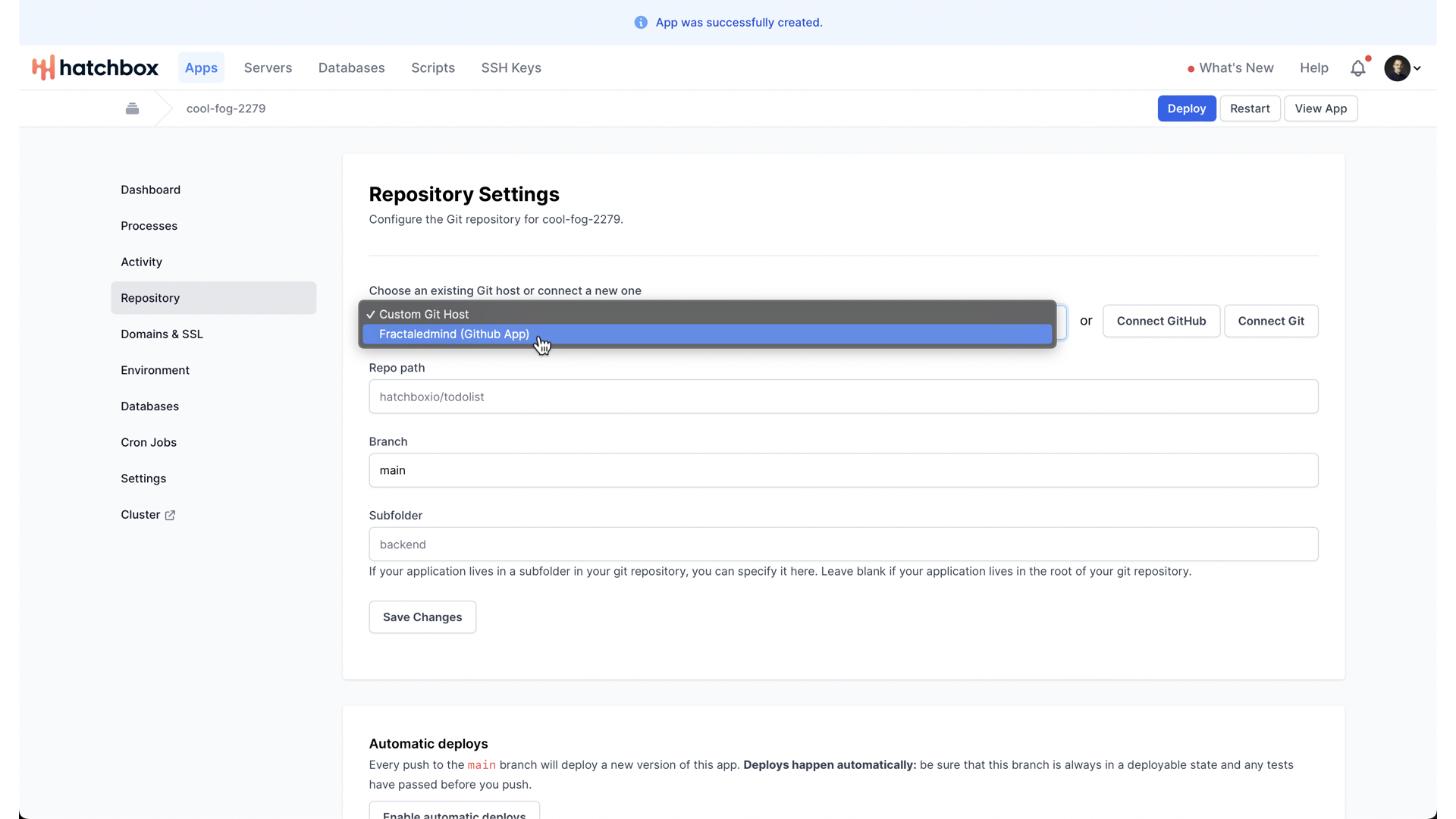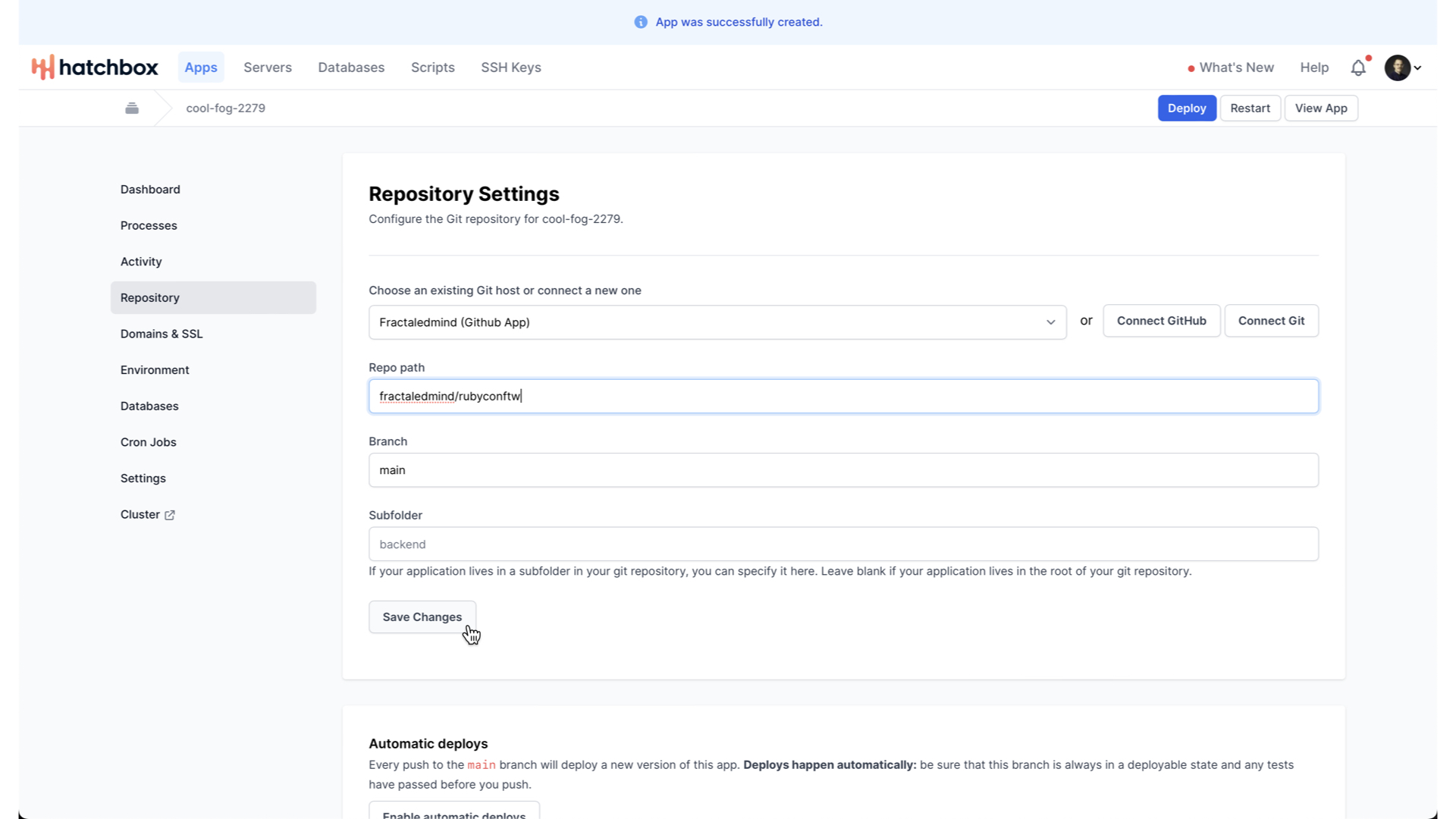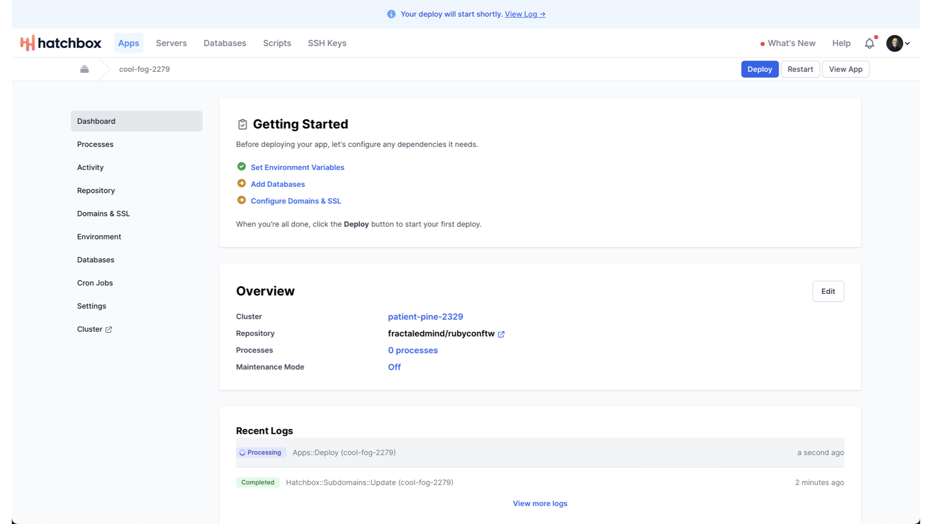 This doesn’t cover all of Hatchbox’s features, but it does cover every single screen used when deploying an application. I hope you found this useful. As always, if you have any questions or comments, just hit me up on Twitter @fractaledmind.