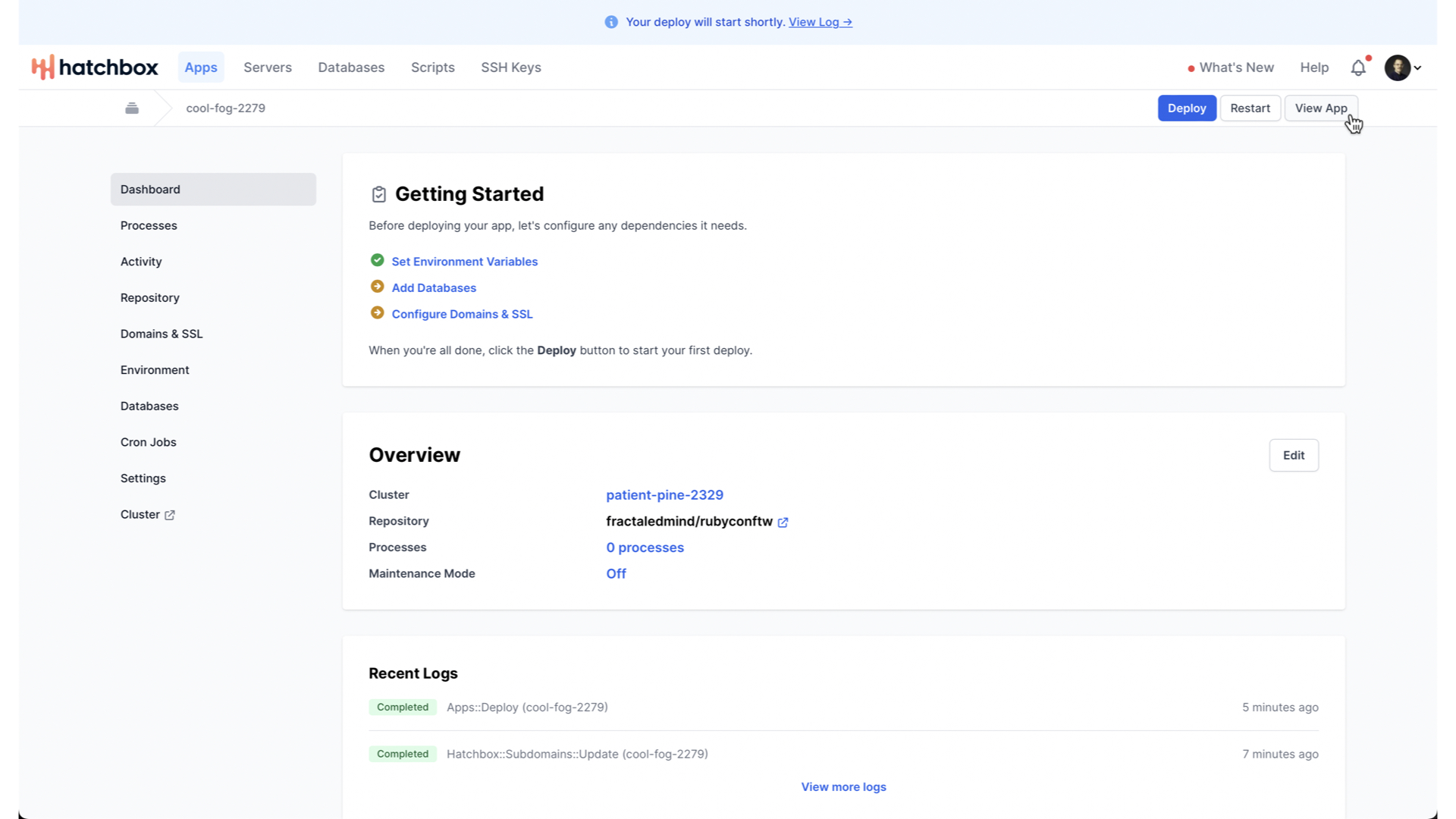 Congrats! As quickly and easily as that, you have a production Rails application running. And I really want to emphasize just how quick and easy that was. In this demo, I am deploying a Rails application that uses SQLite as its database engine, so I am not using Hatchbox’s database management features. But if you are using PostgreSQL, MySQL, or Redis, Hatchbox will automatically provision and manage those for you. And if you are using a different database engine, you can still use Hatchbox, but you will need to manage that database yourself.
