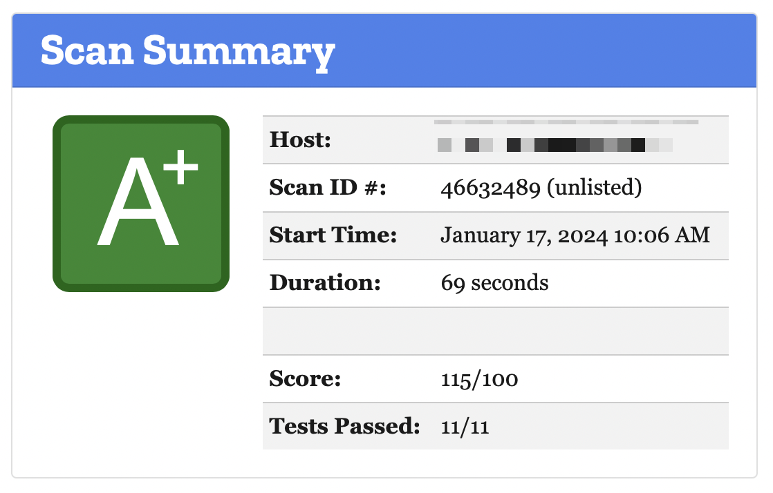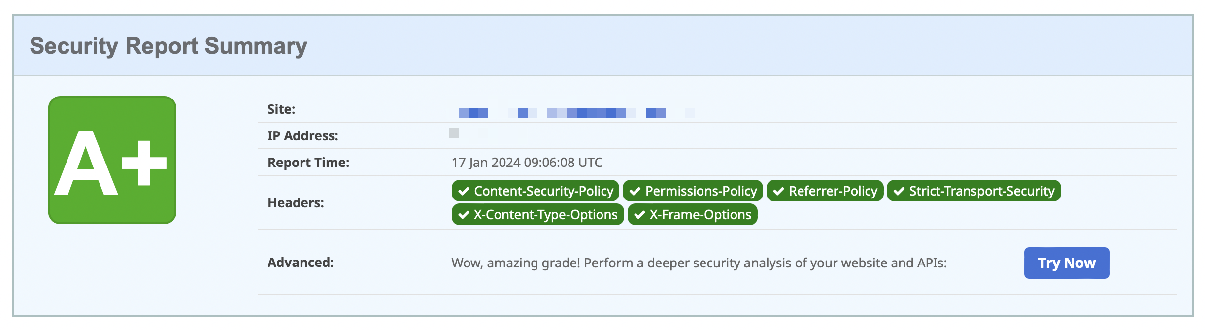 The best place to start is to use the free security headers scan provided by securityheaders.com as well as Mozilla’s Observatory. This will give you a good idea of where you stand, and what you need to do to improve your security posture. When I first ran the security headers scan against my application, I got a C grade 😬.