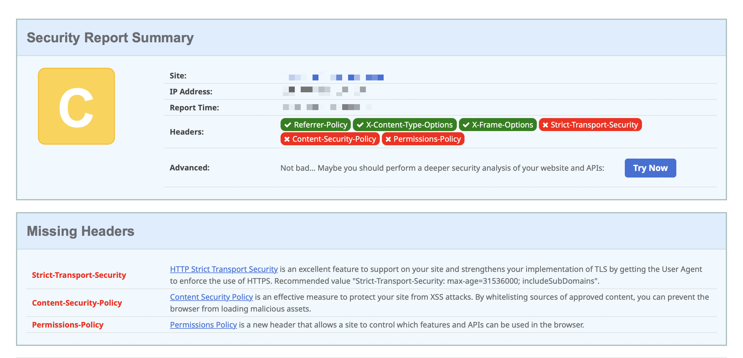 But, both immediately showed me the headers that I needed to add to improve my score. In my case, I was completely missing the Strict-Transport-Security, Content-Security-Policy, and Permissions-Policy headers. So, I started by added these to my application.