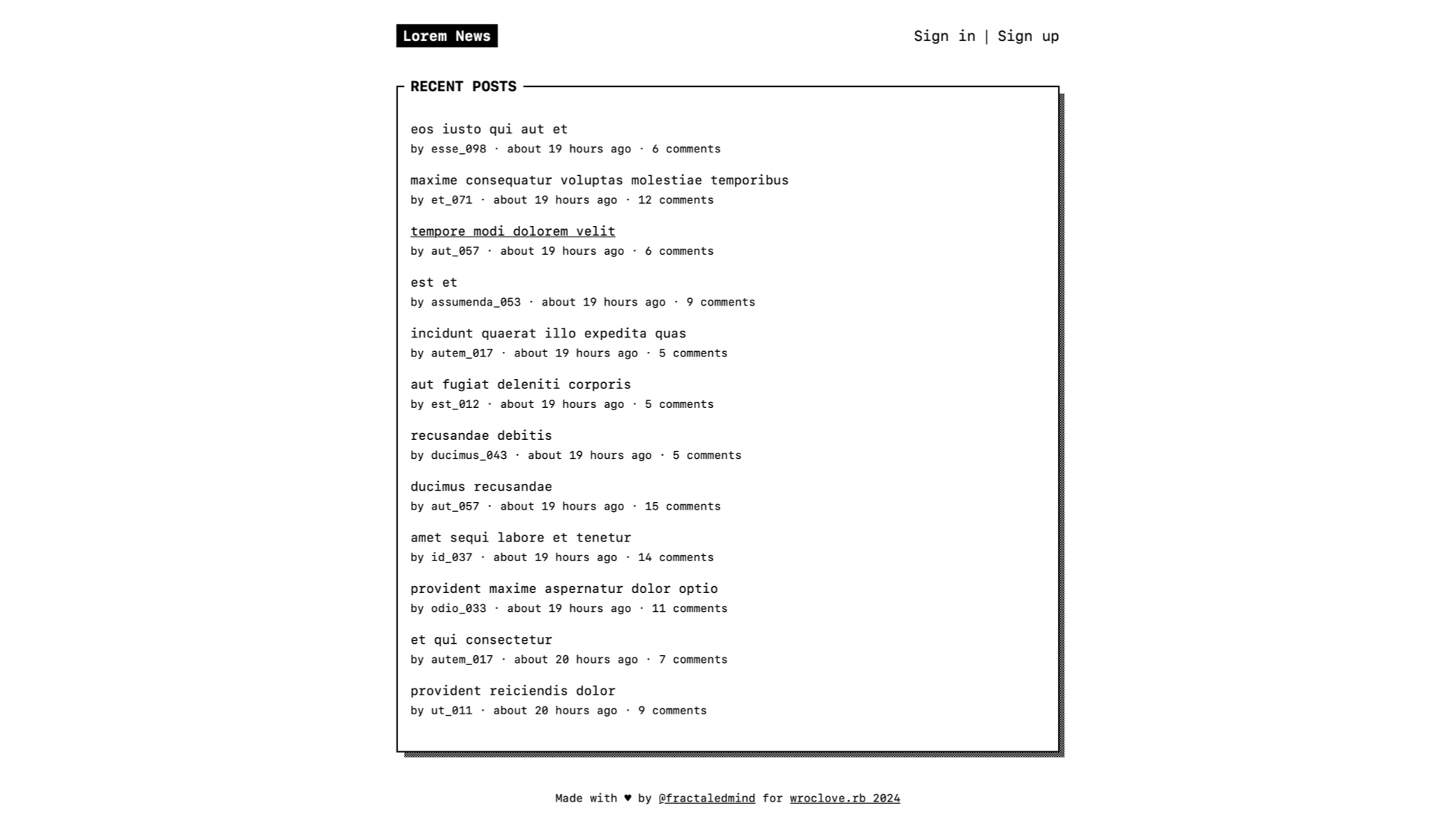 To keep this journey practical and concrete, we will be working on a demo app called “Lorem News”. It is a basic Hacker News clone with posts and comments made by users but all of the content is Lorem Ipsum. This codebase will be the foundation for all of our examples and benchmarks.