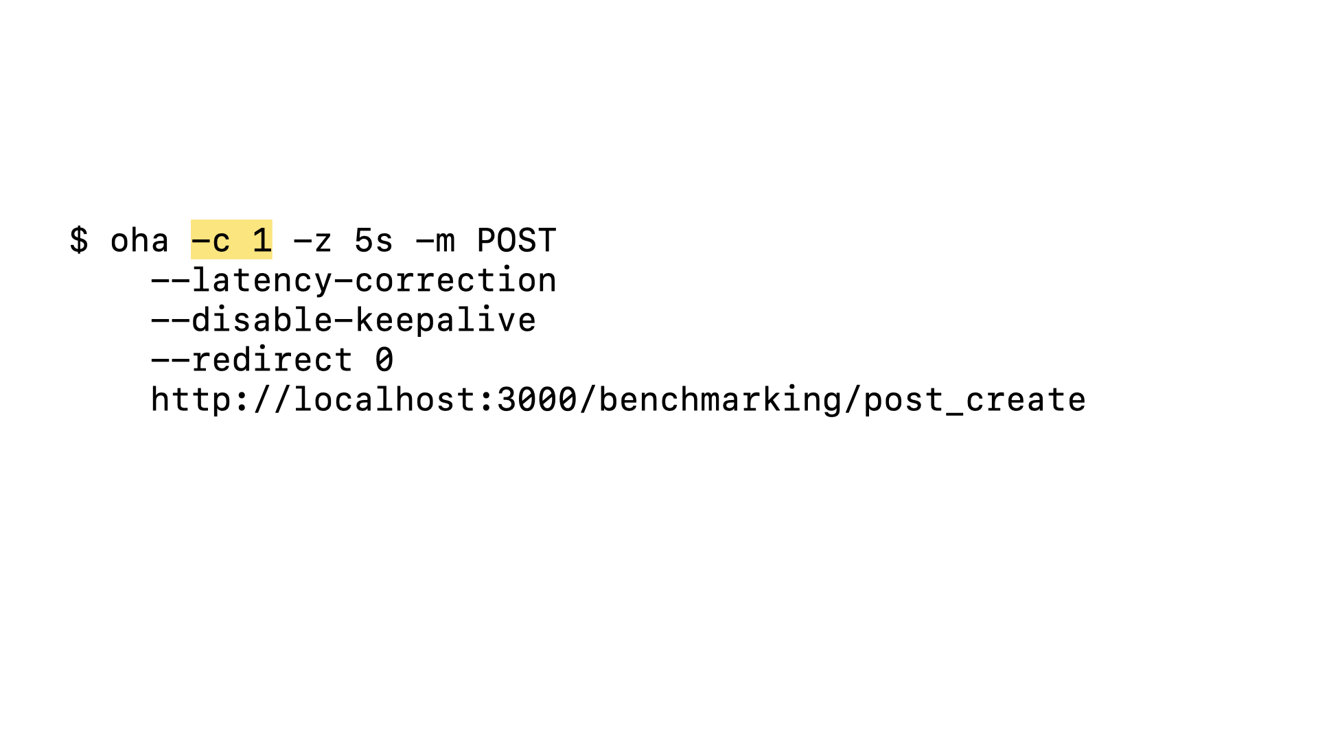 Let’s observe how our demo application performs. We can use the oha load testing CLI and the benchmarking routes built into the app to simulate user activity in our app. Let’s start with a simple test where we sent 1 request after another for 5 seconds to our post#create endpoint.