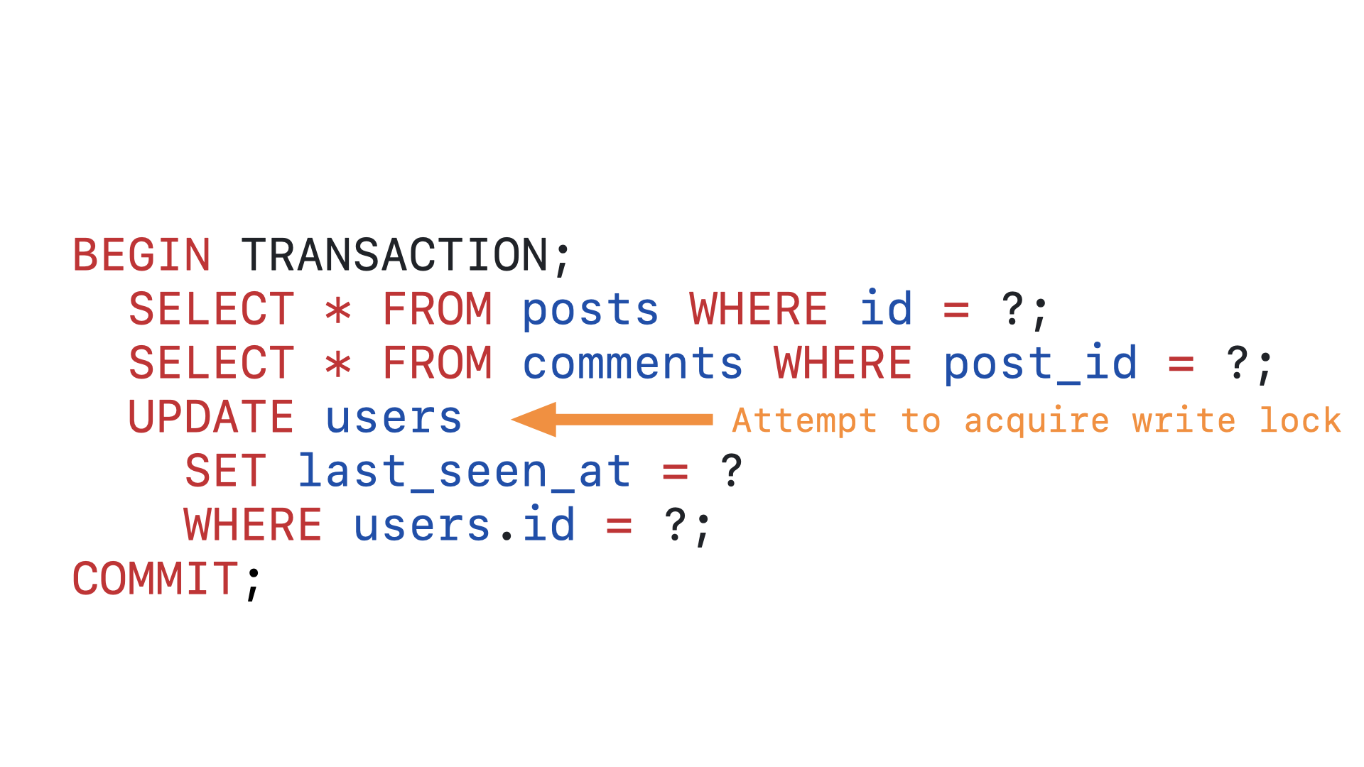 Once the third query completes, our final query can acquire the write lock and run. So long as no query is forced to wait for longer than the timeout duration, SQLite will resolve the linear order of write operations on its own. This queuing mechanism is essential to avoiding SQLITE_BUSY exceptions. But, there is a major performance bottleneck lurking in the details of this feature for Rails applications.