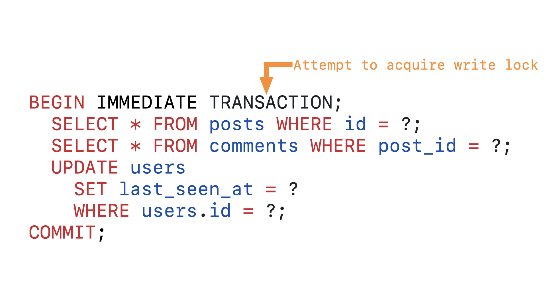 If we instead begin the transaction by explicitly declaring this an immediate transaction, SQLite will be able to queue this query to retry acquiring the write lock again later. This gives SQLite the ability to serialize the concurrent queries coming in by relying on a basic queuing system, even when some of those queries are wrapped in transactions.