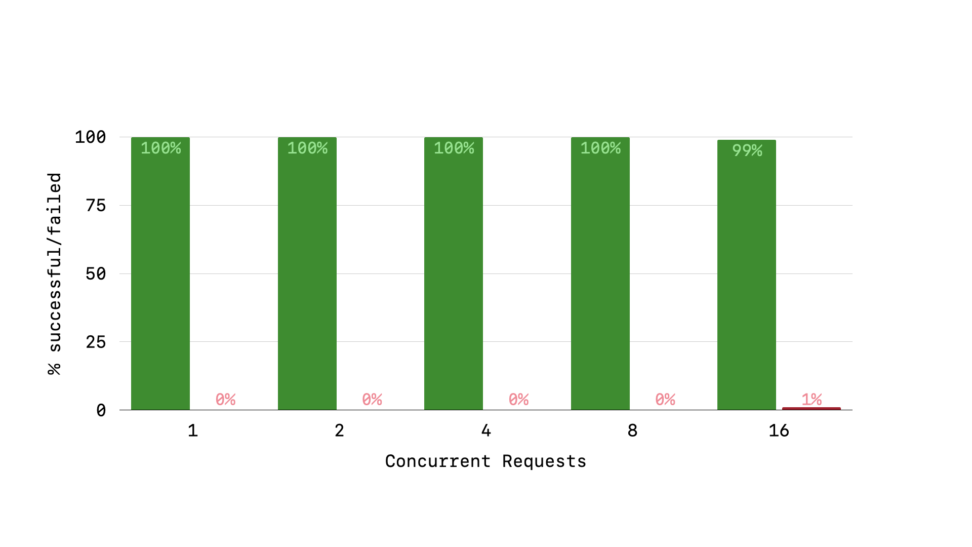 With one simple configuration change, our Rails app now handle concurrent load without throwing nearly any 500 errors! Though we do see some errors start to creep in at 16 concurrent requests. This is a signal that something is still amiss.
