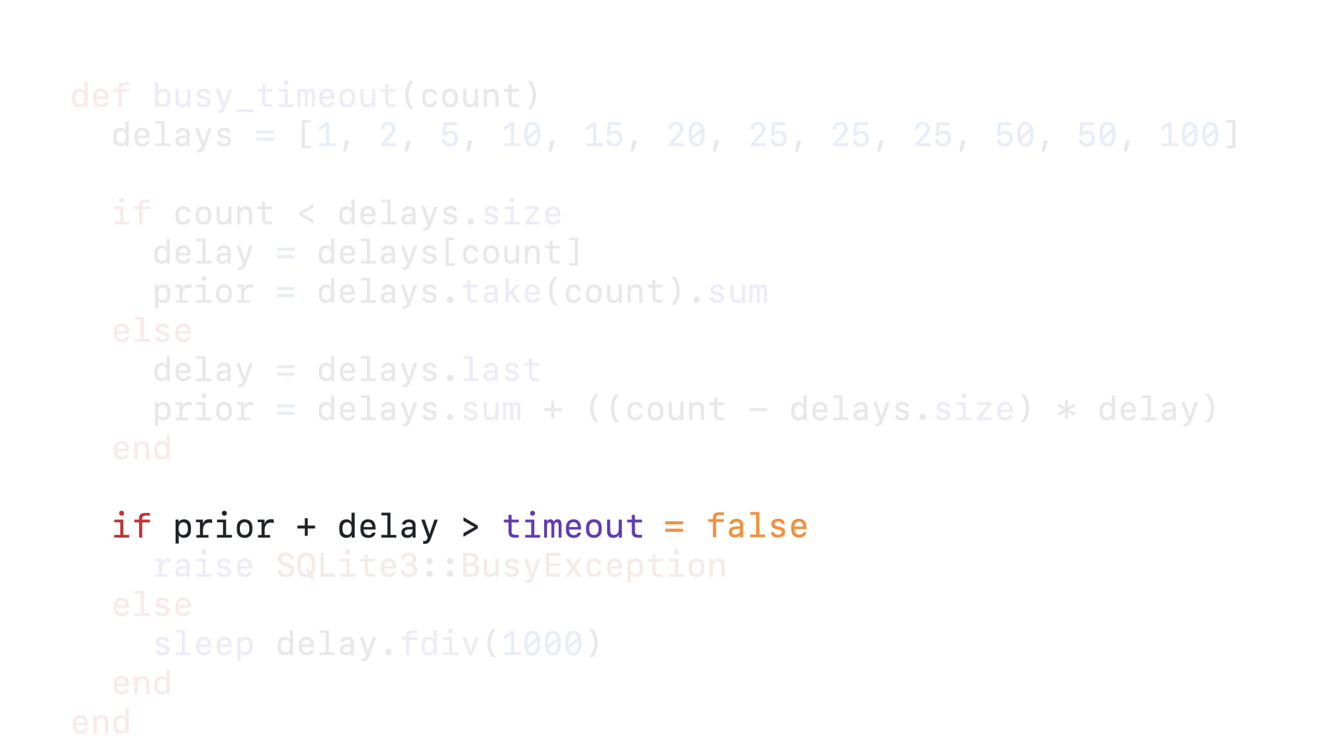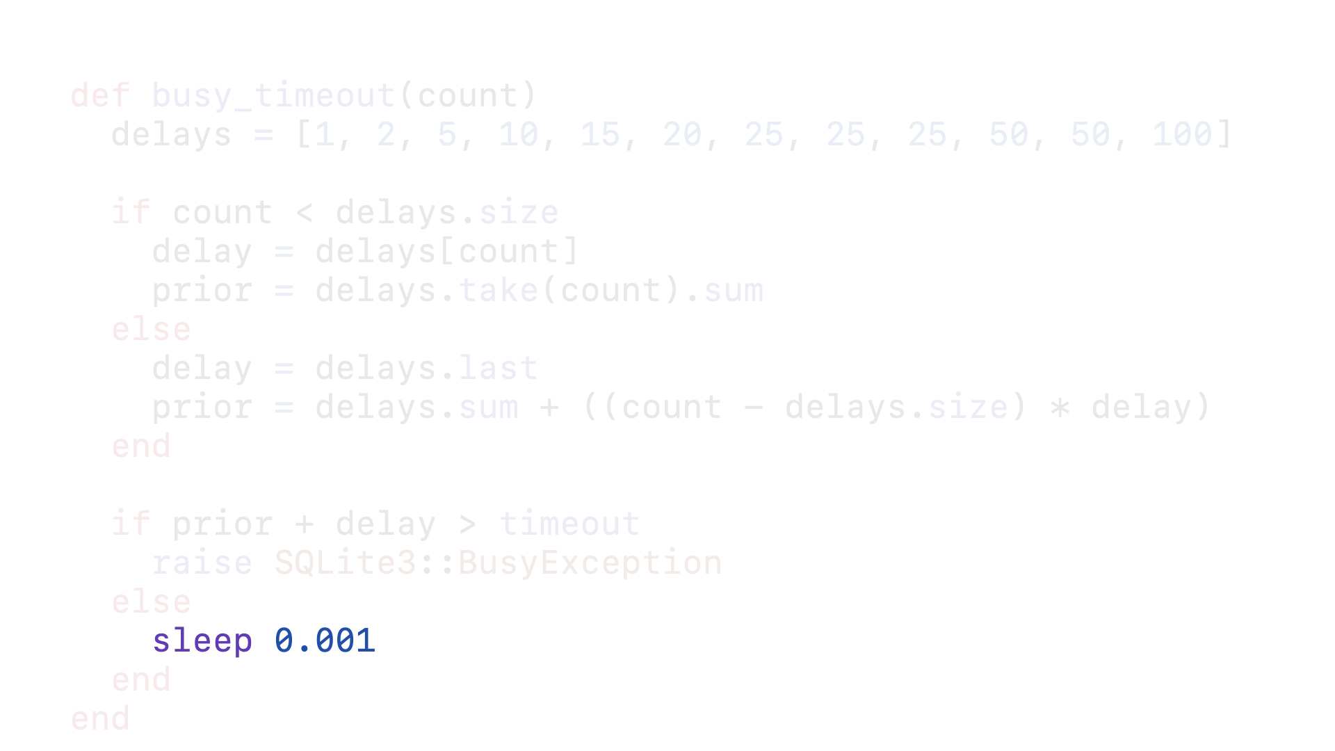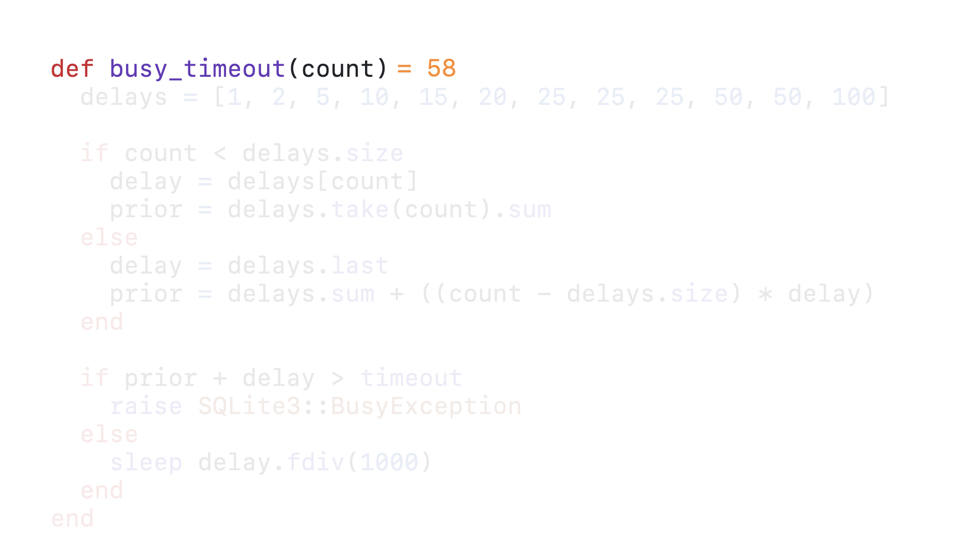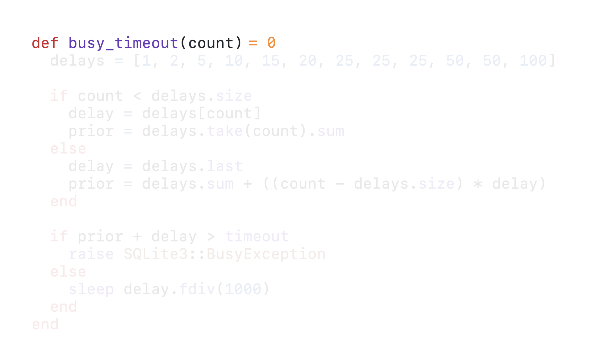 Here is a Ruby implementation of the logic you will find in SQLite’s C source for its busy_timeout. Every time this callback is called, it is passed the count of the number of times this query has called this callback. That count is used to determine how long this query should wait to try again to acquire the write lock and how long it has already waited. By using Ruby’s sleep, we can ensure that the GVL is released while a query is waiting to retry acquiring the lock.