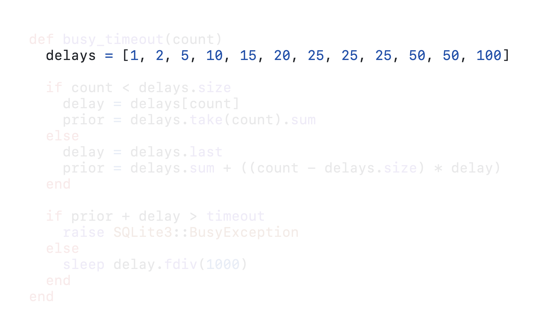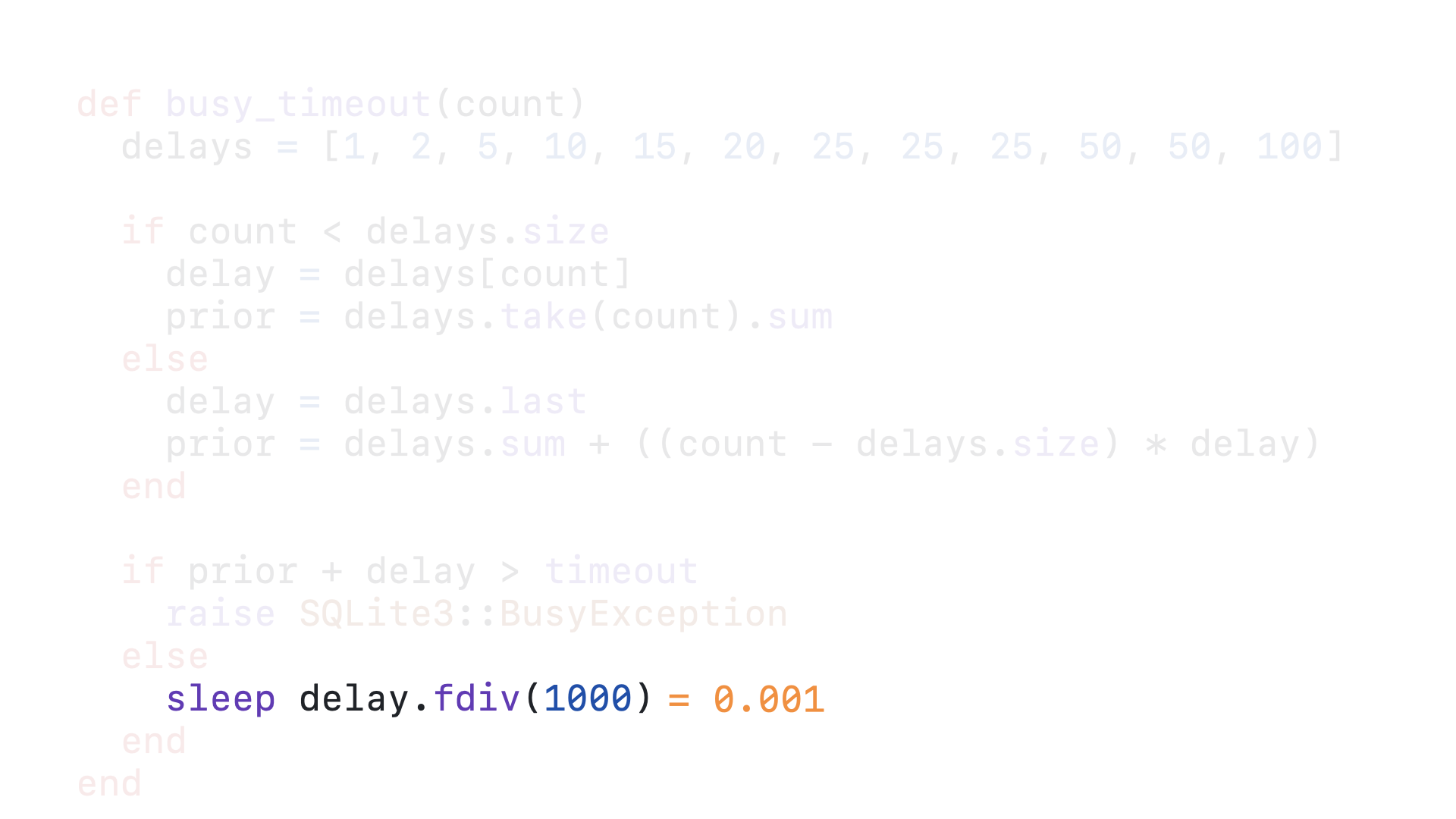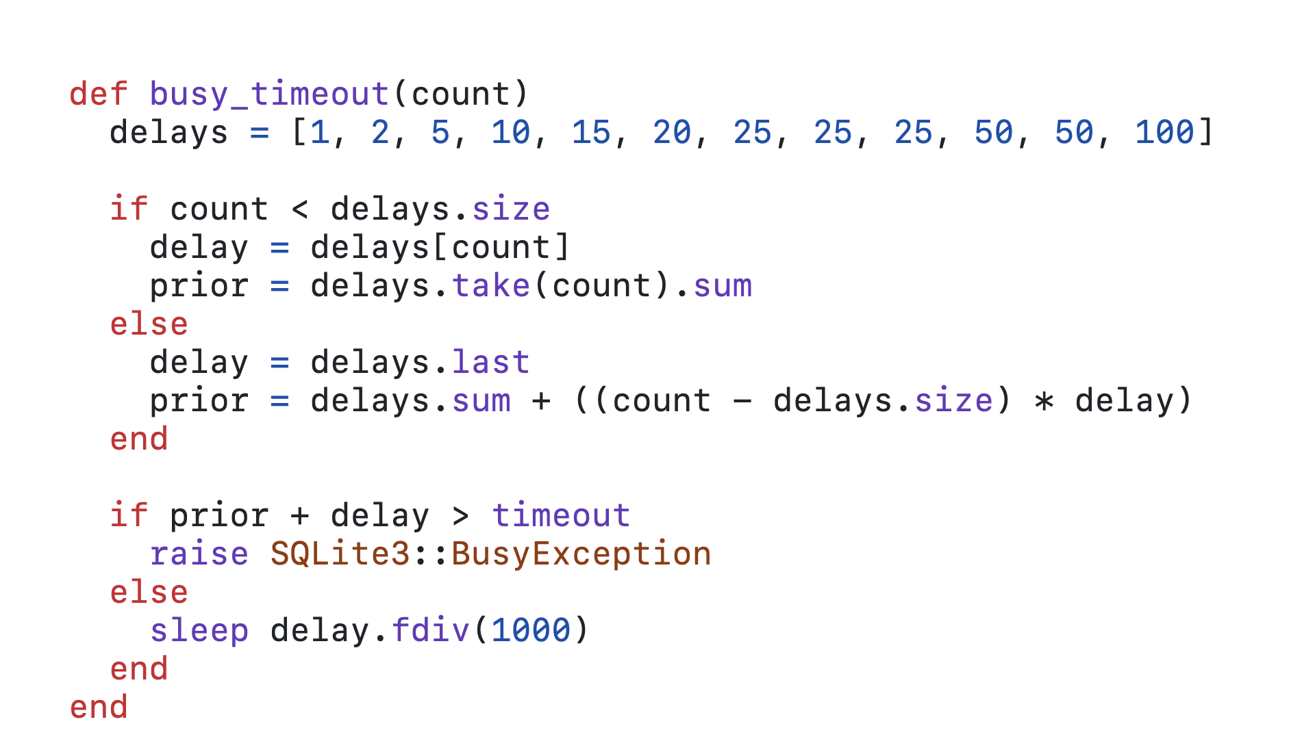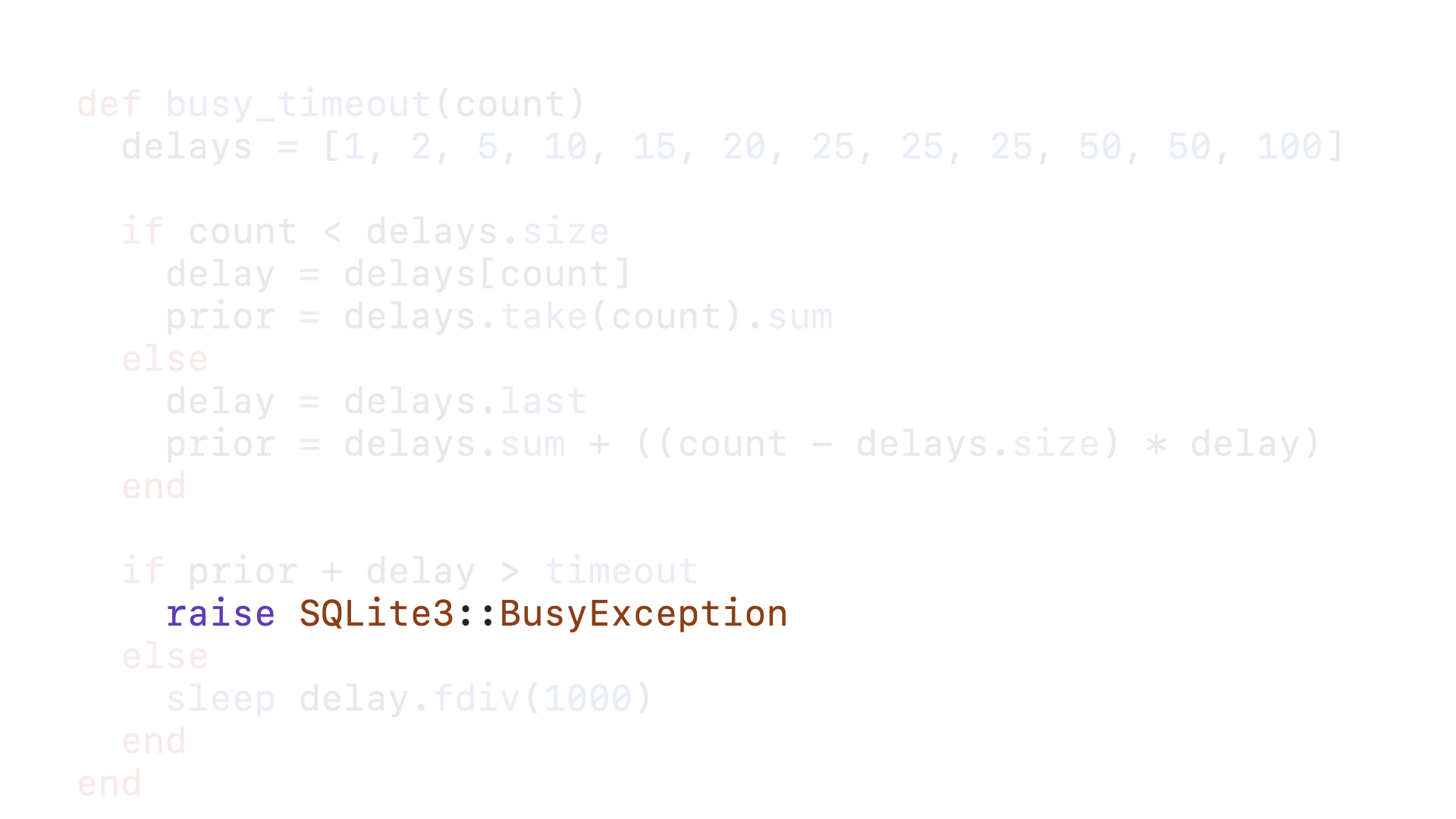 Here is a Ruby implementation of the logic you will find in SQLite’s C source for its busy_timeout. Every time this callback is called, it is passed the count of the number of times this query has called this callback. That count is used to determine how long this query should wait to try again to acquire the write lock and how long it has already waited. By using Ruby’s sleep, we can ensure that the GVL is released while a query is waiting to retry acquiring the lock.