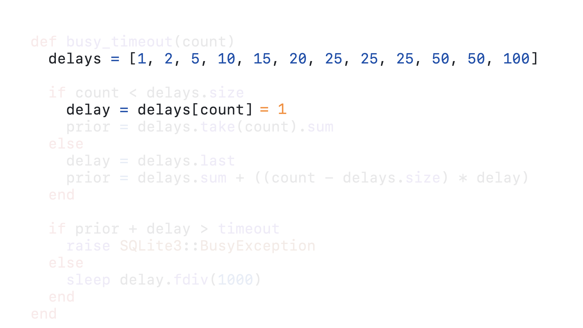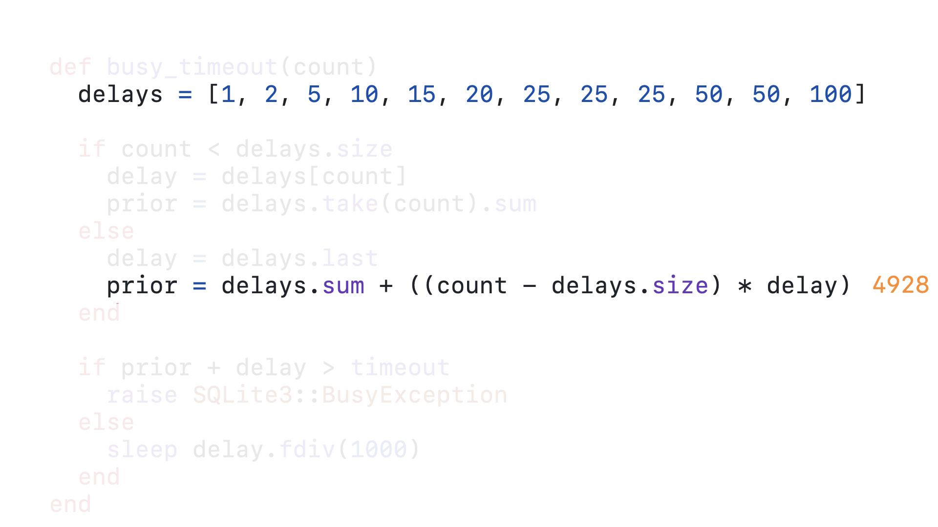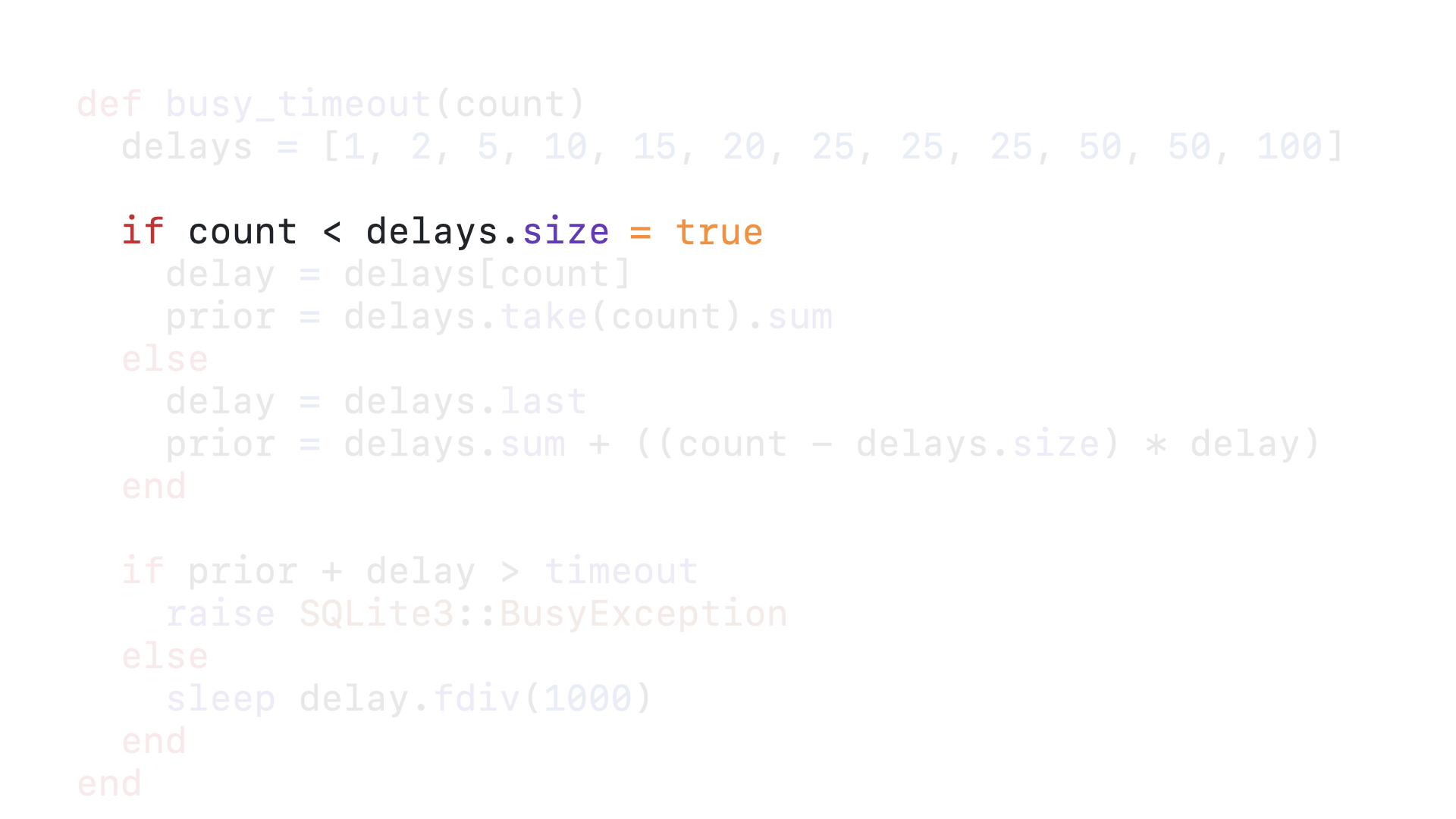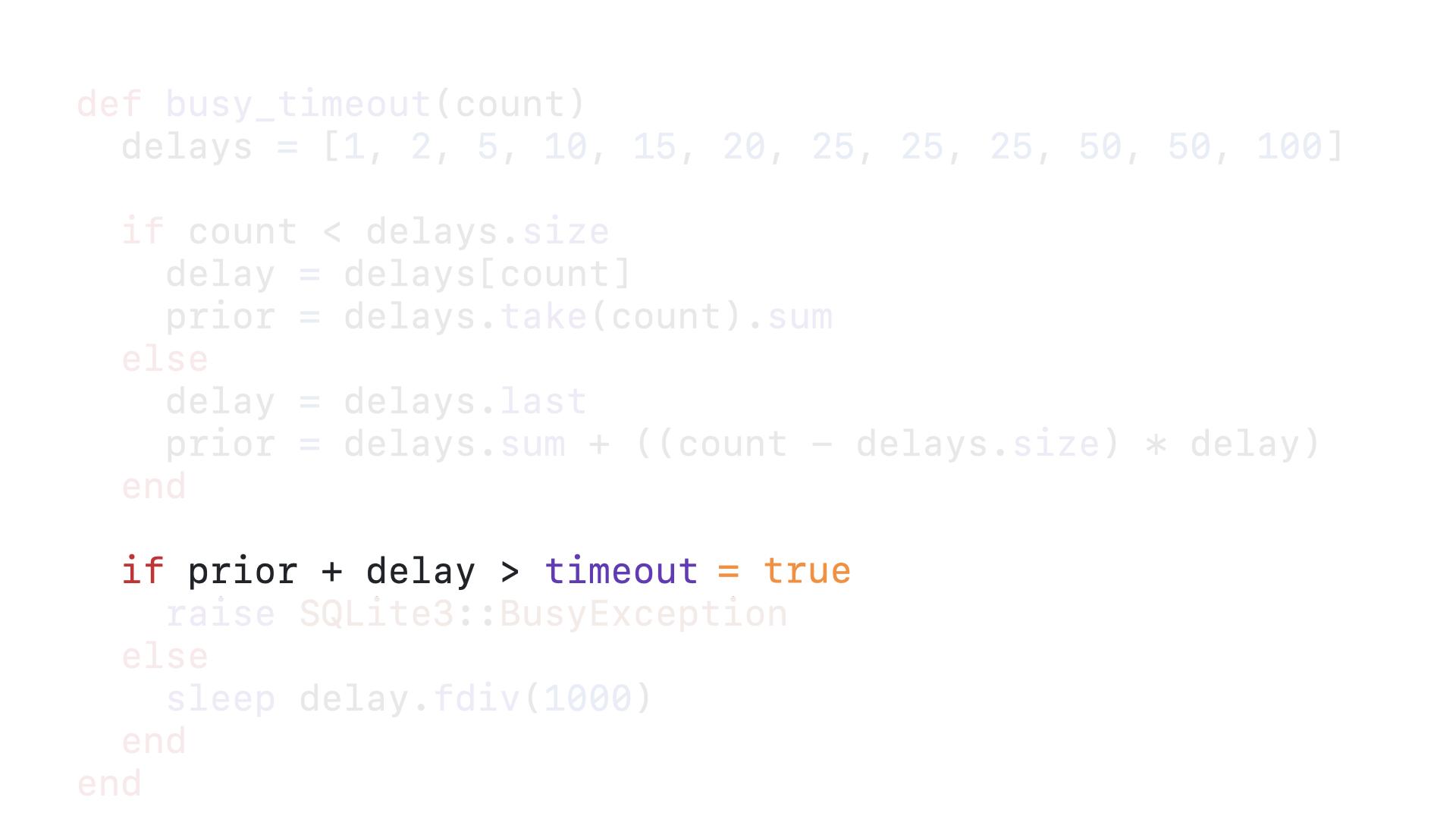 Here is a Ruby implementation of the logic you will find in SQLite’s C source for its busy_timeout. Every time this callback is called, it is passed the count of the number of times this query has called this callback. That count is used to determine how long this query should wait to try again to acquire the write lock and how long it has already waited. By using Ruby’s sleep, we can ensure that the GVL is released while a query is waiting to retry acquiring the lock.