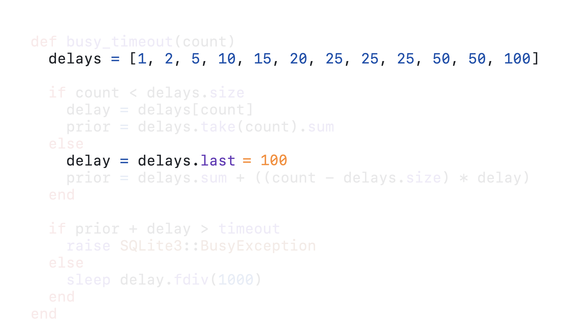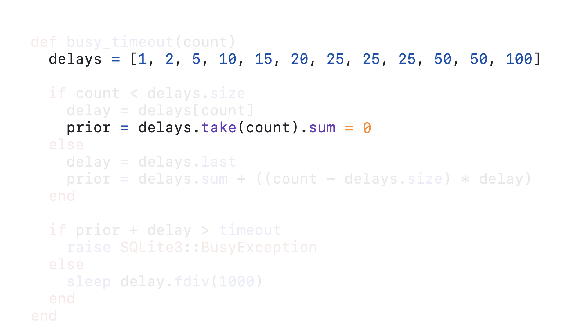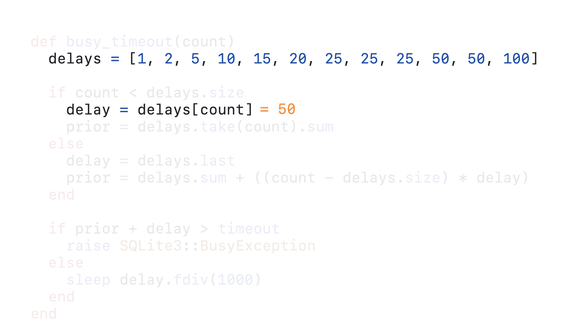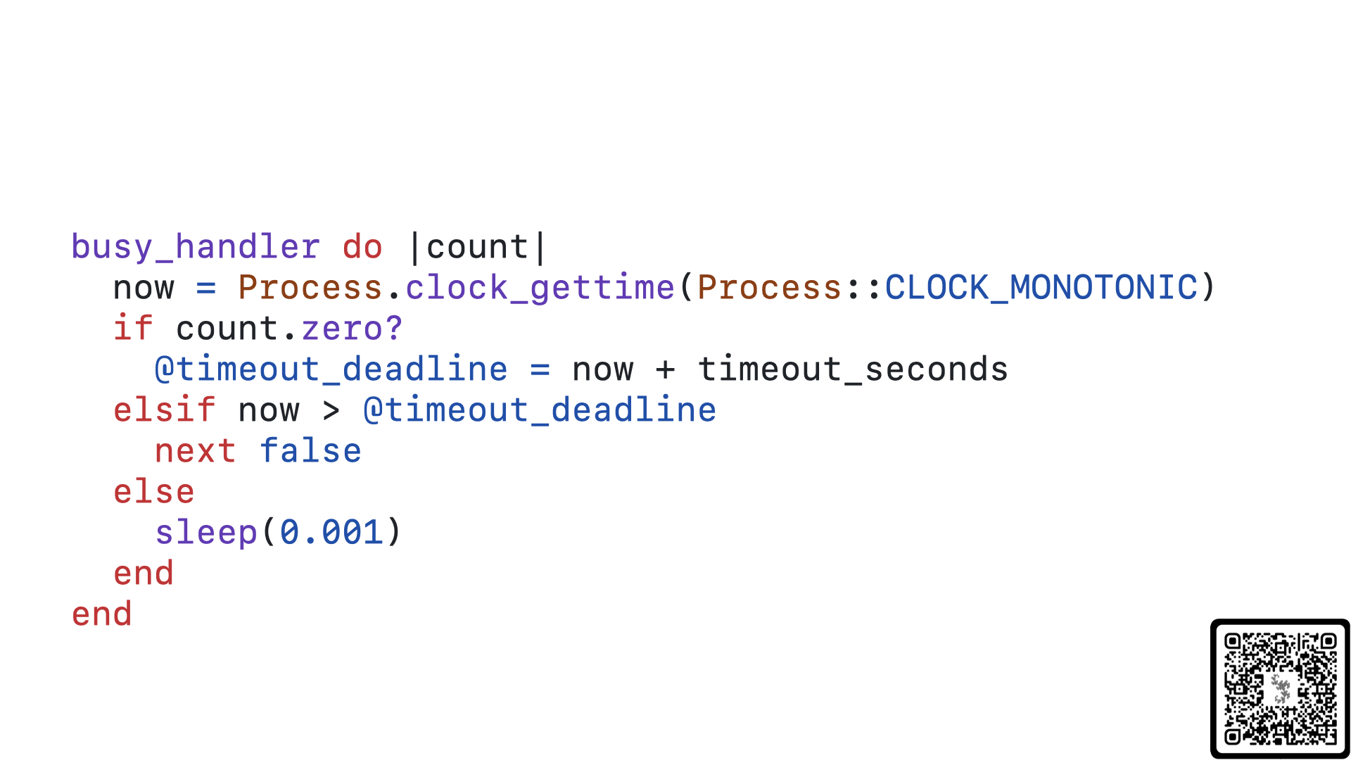 Here is a Ruby implementation of the logic you will find in SQLite’s C source for its busy_timeout. Every time this callback is called, it is passed the count of the number of times this query has called this callback. That count is used to determine how long this query should wait to try again to acquire the write lock and how long it has already waited. By using Ruby’s sleep, we can ensure that the GVL is released while a query is waiting to retry acquiring the lock.