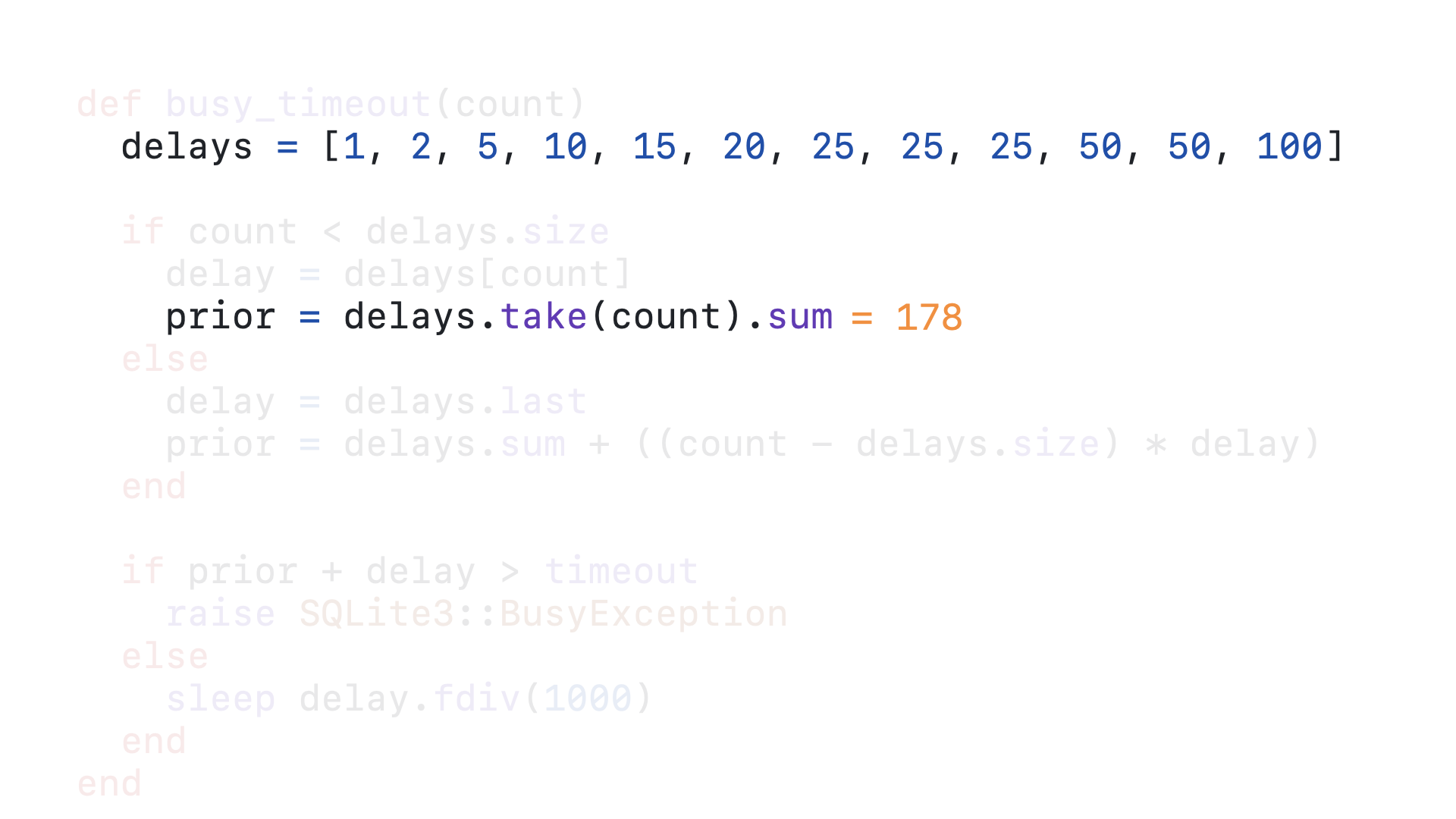 We then take the first 10 elements of the delays array, that is the everything in the array up to but not including the tenth element, and sum those numbers together, which in this case sums to 178. This is how long the query has been delayed for already.
