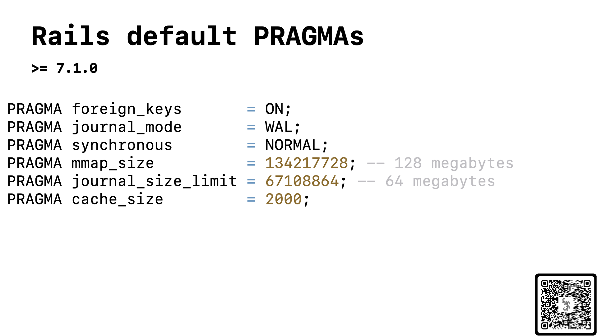 Luckily, starting with Rails 7.1, Rails applies a better default configuration for your SQLite database. These changes are central to making SQLite work well in the context of a web application. If you’d like to learn more about what each of these configuration options are, why we use the values we do, and how this specific collection of configuration details improve things, I have a blog post that digs into these details.