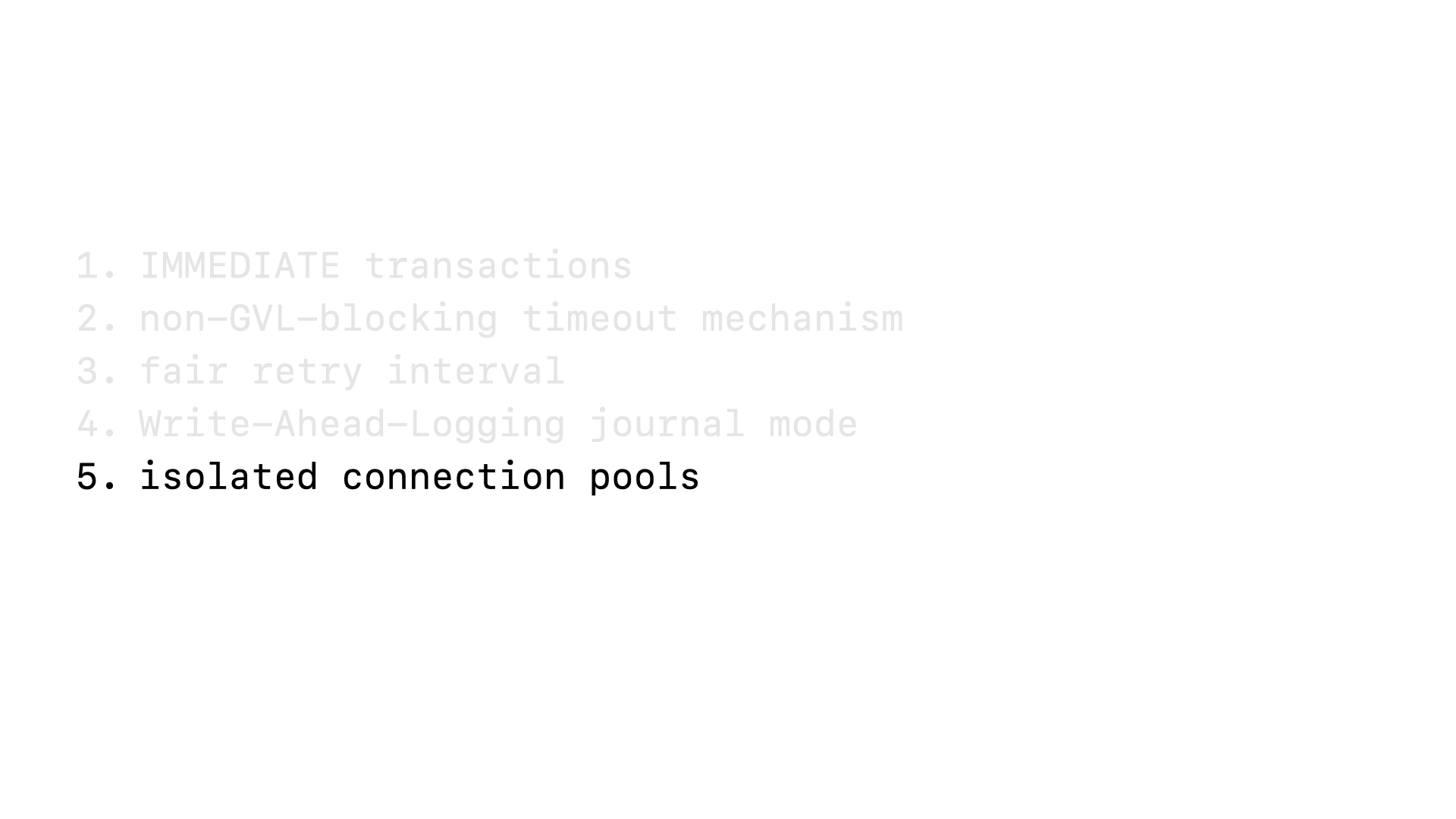 Now, while this isn’t a requirement, there is a fifth lever we can pull to improve the performance of our application. Since we know that SQLite in WAL mode supports multiple concurrent reading connections but only one writing connection at a time, we can recognize that it is possible for the Active Record connection pool to be saturated with writing connections and thus block concurrent reading operations.