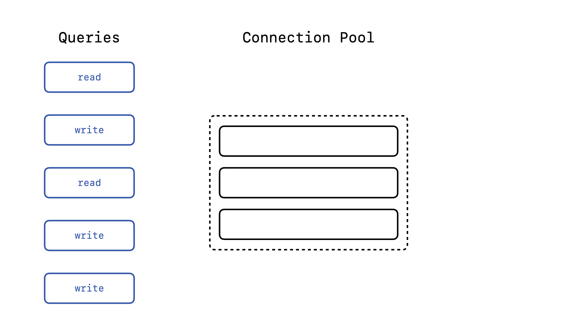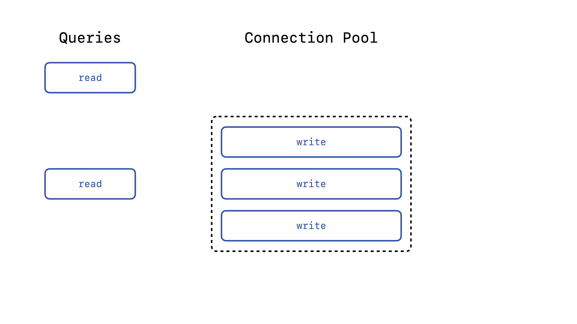 The remaining read queries have to wait until one of the write queries releases a connection. Ideally, since we are using SQLite in WAL mode, read queries should never need to wait on write queries. In order to ensure this, we will need to create two distinct connection pools—one for reading operation and one for writing operations.