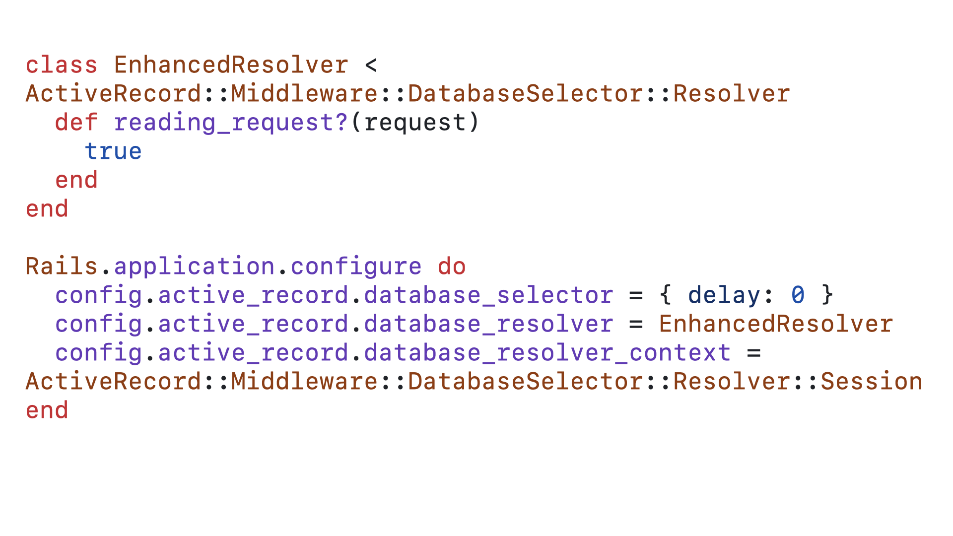 By putting this code in an initializer, we will force Rails to set the default database connection for all web requests to be the reading connection pool. We also tweak the delay configuration since we aren’t actually using separate databases, only separate connections, we don’t need to ensure that requests “read your own writes” with a delay.