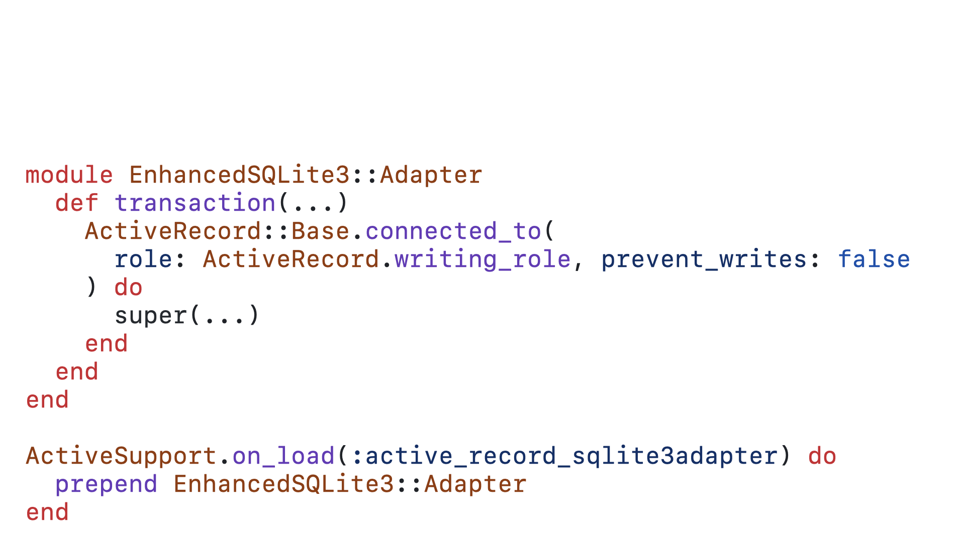 We can then patch the transaction method of the ActiveRecord adapter to force it to connection to the writing database.