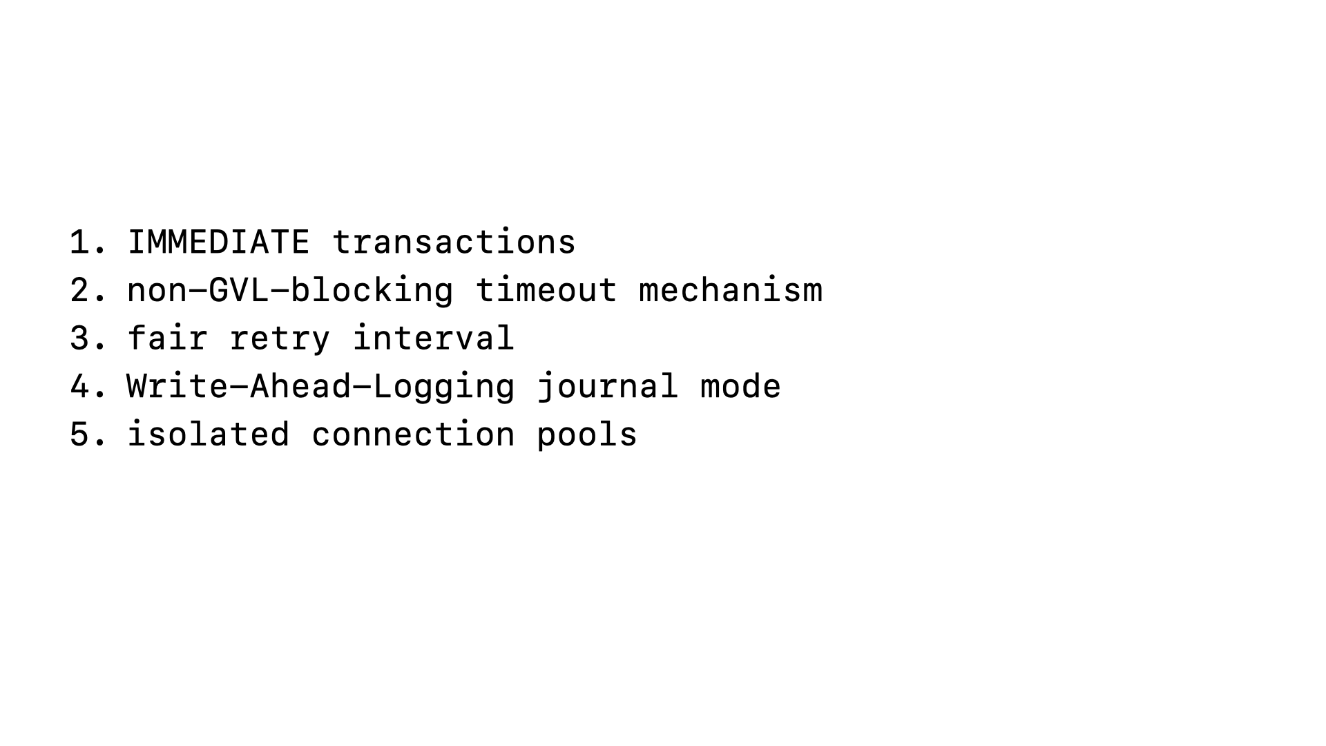 Because SQLite is embedded within your Ruby process and the thread that spawns it, care must be taken to release Ruby’s global VM lock (GVL) when the Ruby-to-SQLite bindings execute SQLite’s C code. By design, the sqlite3-ruby gem does not release the GVL when calling SQLite. For the most part, this is a reasonable decision, but for the busy_timeout, it greatly hampers throughput.