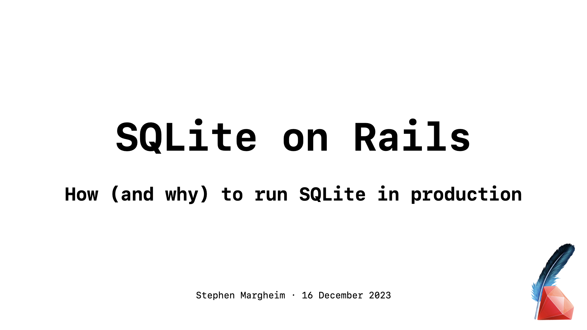 When building a full-featured Rails application, you will want not just a database to store your model data; you will want a job queue backend, a cache backend, maybe even a pubsub backend. When building a Rails app leveraging the power and simplicity of SQLite, you will likely wonder how best to architect these various services? 37signals has been releasing new gems to use solid-state storage via relational databases. They default to using one database to back all of these services, but they use MySQL. How should we handle this with SQLite?